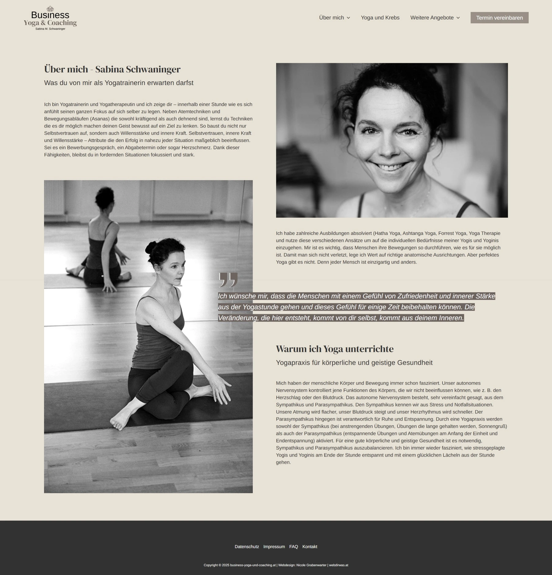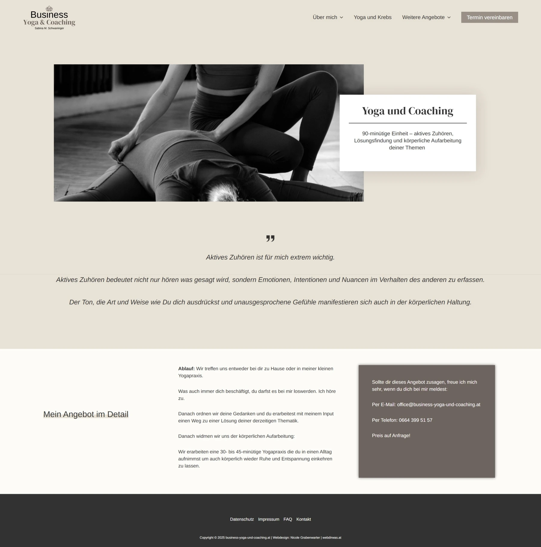 Mit der neuen Website konnte die Kundin ihr Angebot optisch aufwerten, die Benutzerfreundlichkeit steigern und ihre Marke klar als Business-orientiert positionieren. Gleichzeitig sorgt die professionelle Umsetzung dafür, dass sie im Raum Wien für Business-Yoga-Angebote gut in Suchmaschinen gefunden wird.